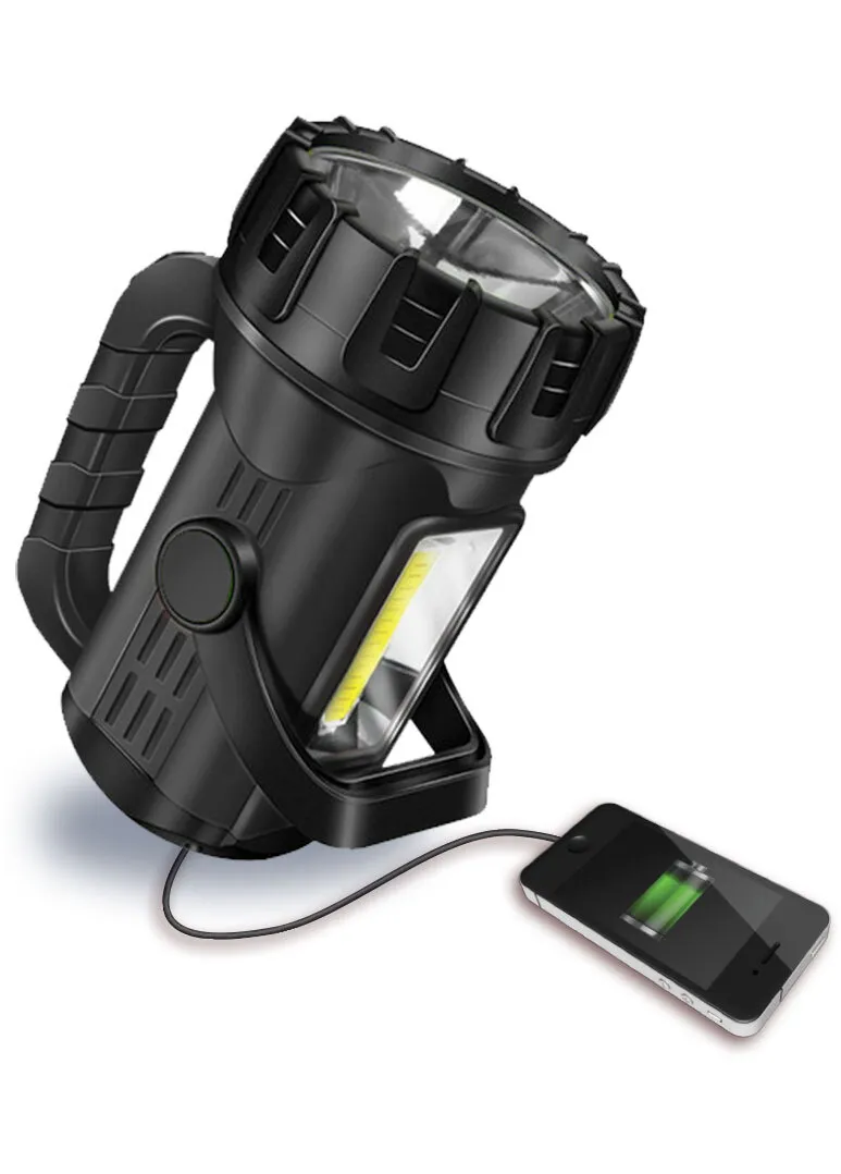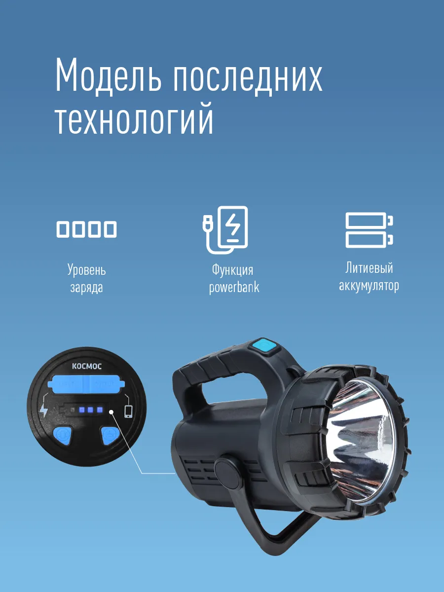 Многофункциональный аккумуляторный фонарь КОСМОС Ac8010WLith – новинка линейки PREMIUM. Прибор снабжён ёмкой литиевой батареей, имеющей долгий срок службы и обеспечивающей работу светодиодов протяженностью до 10 часов. Также фонарь оснащён встроенным powerbank с USB-разъёмом для зарядки любых мобильных устройств, что очень актуально в наш век интернета и соцсетей. Имеет яркий головной светодиод мощностью 5 Вт, освещающий расстояние на 290 м, и боковую светодиодную панель COB, благодаря чему может использоваться как кемпинговый светильник.