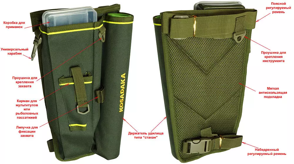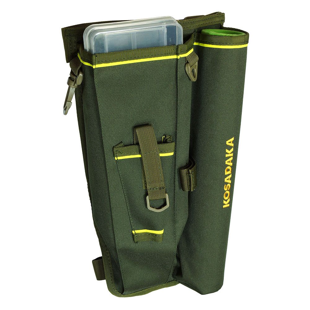 Набедренная сумка KOSADAKA M10 с жёстким держателем для удилища для освобождения рук в случае необходимости. Также сумка оснащена несколькими креплениями для инструментов. Коробка для приманок, входящая в комплект, помещается в специальный карман конической формы.