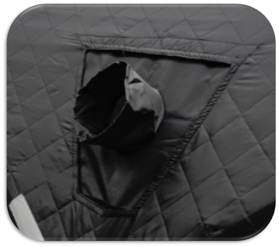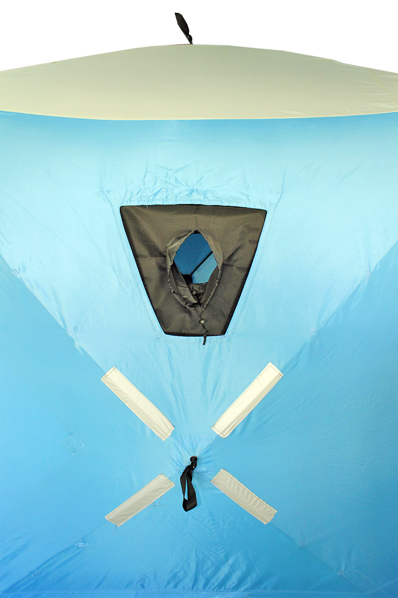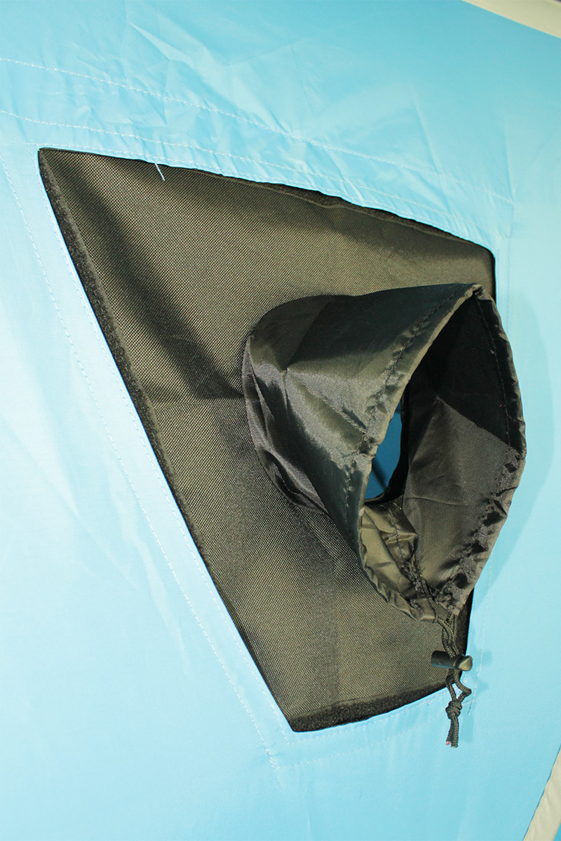 Окно из плотной ткани Oxford 600D для зимних палаток WOODLAND. Имеет регулируемый клапан с утяжкой, предназначенный для вывода вытяжной трубы из палатки. Труба должна быть изолирована, ткань не огнеупорная.