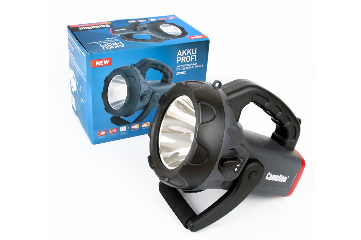 Аккумуляторный фонарь Camelion 2931R2 имеет дальность луча до 230 м благодаря светодиоду мощностью 10 Вт. Режимы переключаются тумблером. Поворотную ручку с каучуковой вставкой можно использовать и для переноски в руке, и в качестве подставки. Корпус защищен от брызг. В комплекте адаптеры для зарядки от сетей 220 и 12V, а также наплечный ремешок.