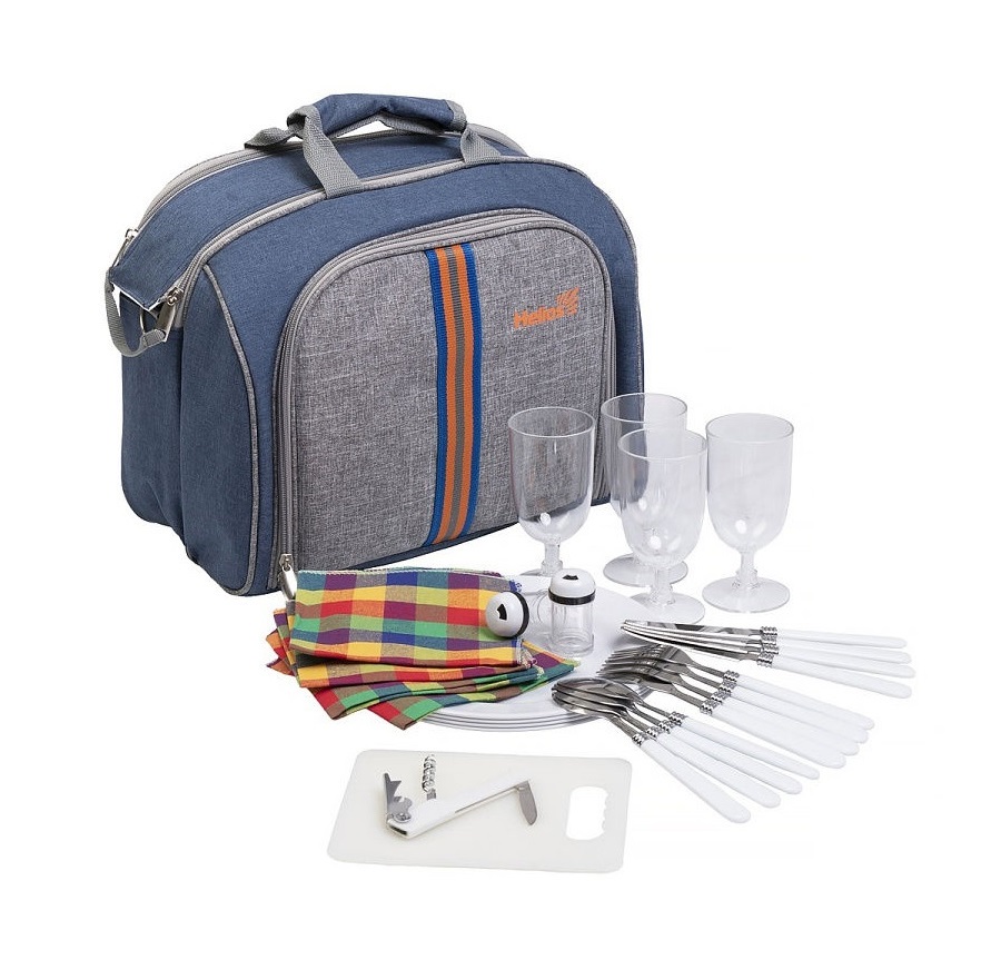 Набор для пикника на 4 персоны HELIOS HS-425S-(4)BG включает в себя сумку, которую отличает стильный и эргономичный дизайн: удобная ручка, наплечный ремень, термоизолированное отделение под продукты, удобно закрывающееся на две молнии. На передней части сумки расположено отделение с предметами набора. Сверху все предметы закреплены на резинки-фиксаторы, снизу – помещены в сетчатые кармашки. Предметы набора выполнены из пищевой стали, матового и белого пластика.