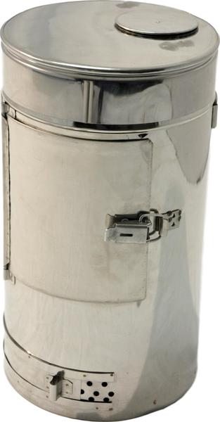 Печка Рыбака 10 л представляет собой цилиндр с дверцей и съемным верхом. Трубы при транспортировке укладываются внутрь корпуса. Внутри печки имеется колосник и регулируемое поддувало для подачи воздуха, позволяющее менять активность горения и поддерживать комфортную температуру внутри палатки. Поддувало выполнено в виде поворотного диска с отверстиями, ручка регулировки которого расположена внизу корпуса. Печка устанавливается на складные ножки для избежания нагрева пола палатки. В низу печки устанавливается поддон в виде тарелки, фиксирующий ножки в открытом положении и уменьшающий прогрев льда и его таяние, а также исключающий выпадение пепла через поддувало. На корпусе есть раскладные ручки, за которые можно безопасно браться для перемещения печки. Патрубок дымохода утоплен внутрь печки для безопасности и удобства при перевозке. Перед патрубком встроен искрогаситель, предотвращающий вылет искр в трубу. Для транспортировки печка комплектуется прочным чехлом из ткани Оксфорд 600D.