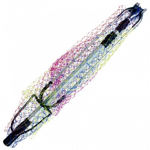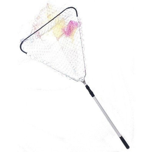 Складной телескопический подсачек KAIDA A12-50 имеет треугольную форму. Сетка сделана из цветной лески, диаметр ячейки 25 мм. Ручка и замок металлические, длина регулируется посредством фиксации каждого из трёх колен.