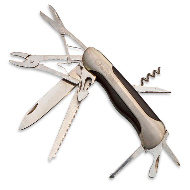 Мультитул KOSADAKA FPMT03 – это набор необходимых инструментов, выполненный в виде многофункционального перочинного ножа. Изготовлен из качественной нержавеющей стали, для облегчения веса в конструкции рукоятки использованы легкие алюминиевые вставки. Мультитул включает маленькие ножницы с пружинкой, пассатижи, пилку по дереву, ножи большой и маленький, отвёртки крестовую и плоскую, штопор, открывашку для консервов и бутылок.