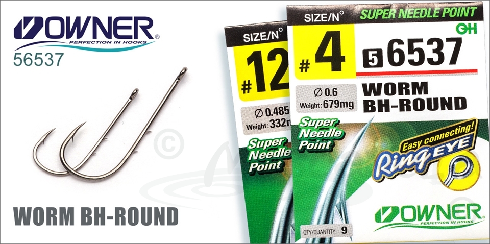 Owner 56538 BC Worm BH-Round – надежные крючки из тонкой проволоки с колечком и насечкой на цевье для удержания червя. Имеют чуть менее круглый загиб, чем у аналогичной серии 56537. Подходят также и для другой мягкой наживки: креветок, мяса моллюсков.