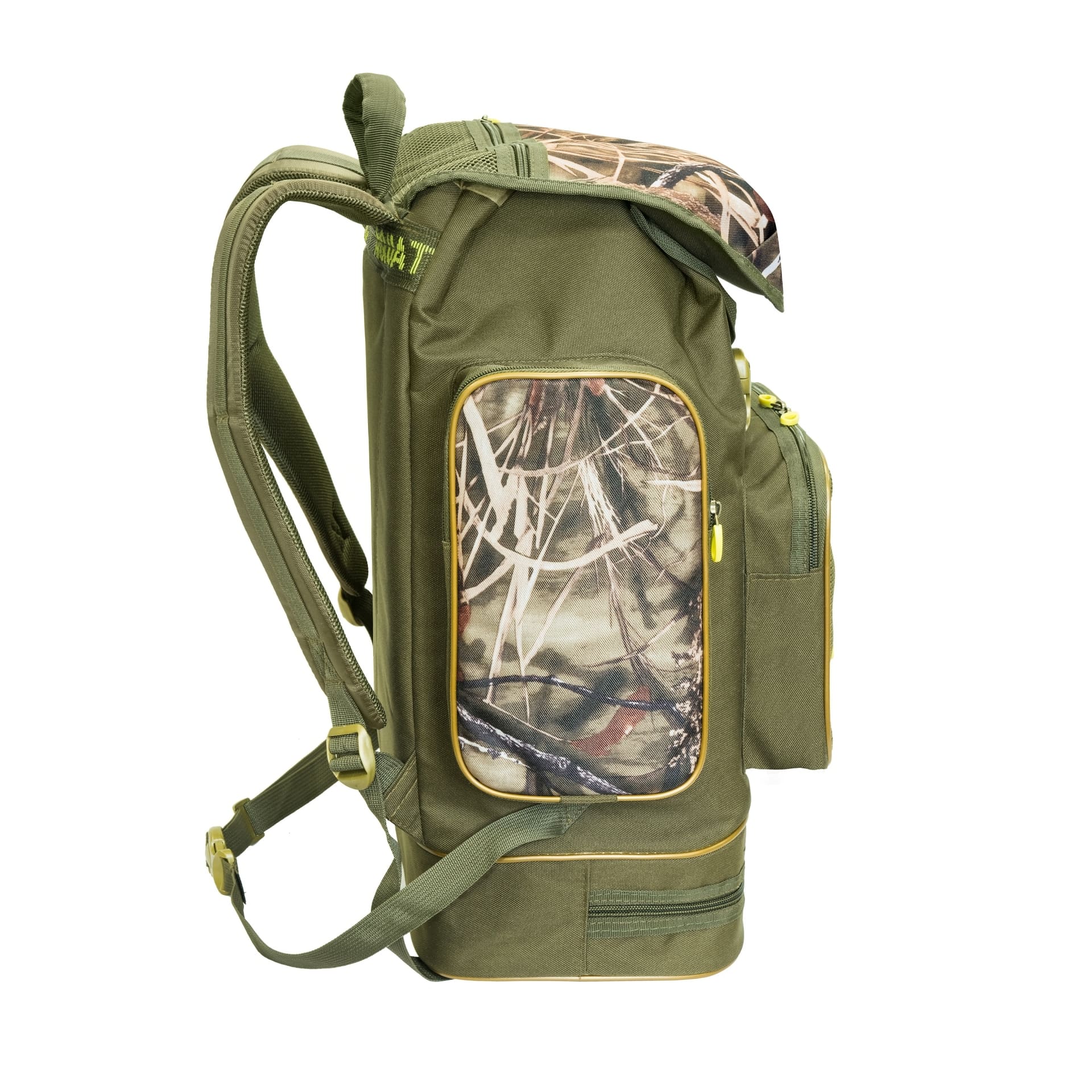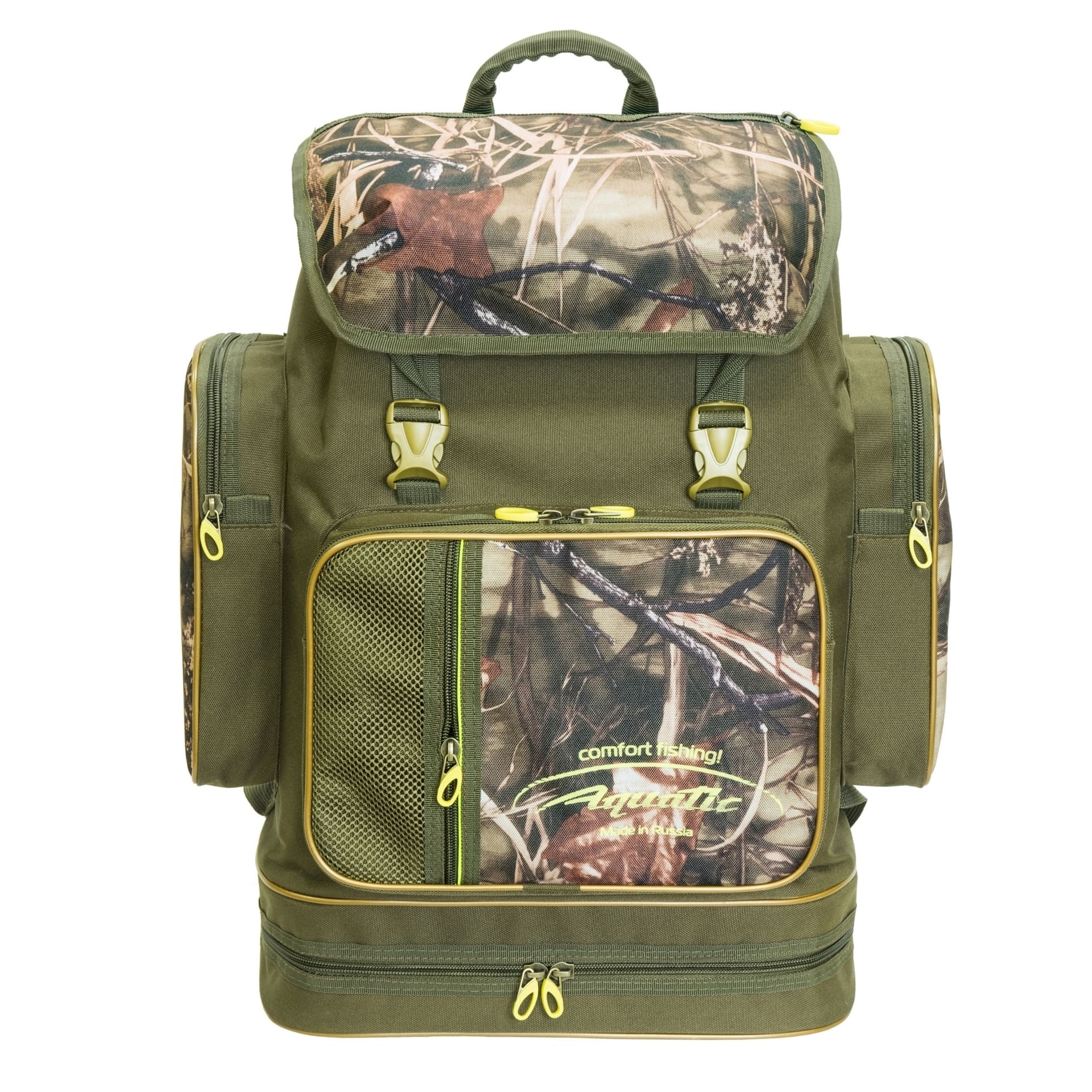 Рыболовный рюкзак Aquatic Р-49 объёмом 45 литров изготовлен из влагостойких нейлоновых материалов повышенной прочности. Вход в основное отделение расположен под клапаном. Имеется нижнее вентилируемое отделение для обуви или мокрых вещей. Также модель снабжена семью внешними карманами для различных мелочей и уплотнённой спинкой для удобства переноски. Рюкзак Aquatic Р-49 пользуется большой популярностью у рыболовов и охотников благодаря сочетанию функциональности и доступной цены.
