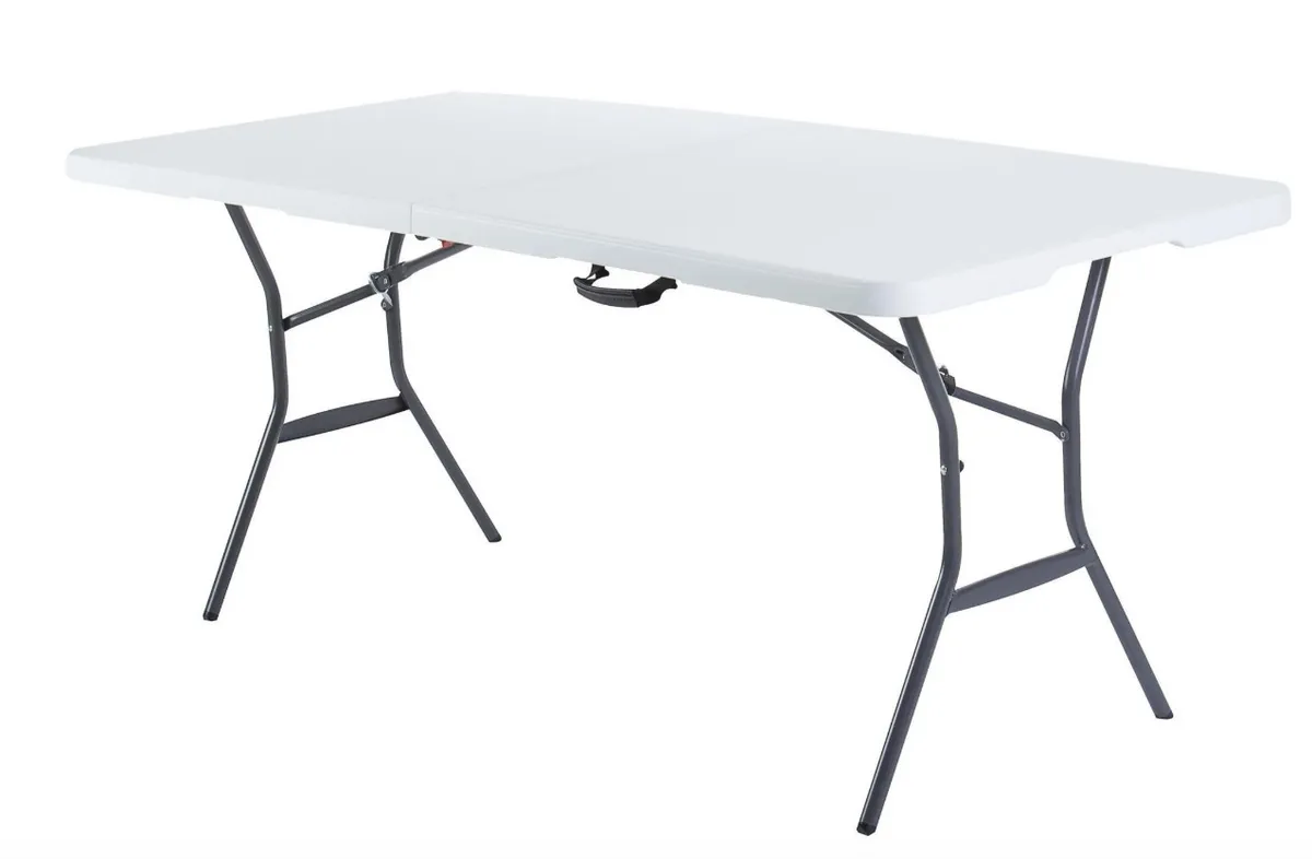 Складывается пополам в виде чемоданчика, имеет ручку для переноски. В дополнение к столу можно приобрести чехол из прочной брезентовой ткани, куда поместится также пара стульев.