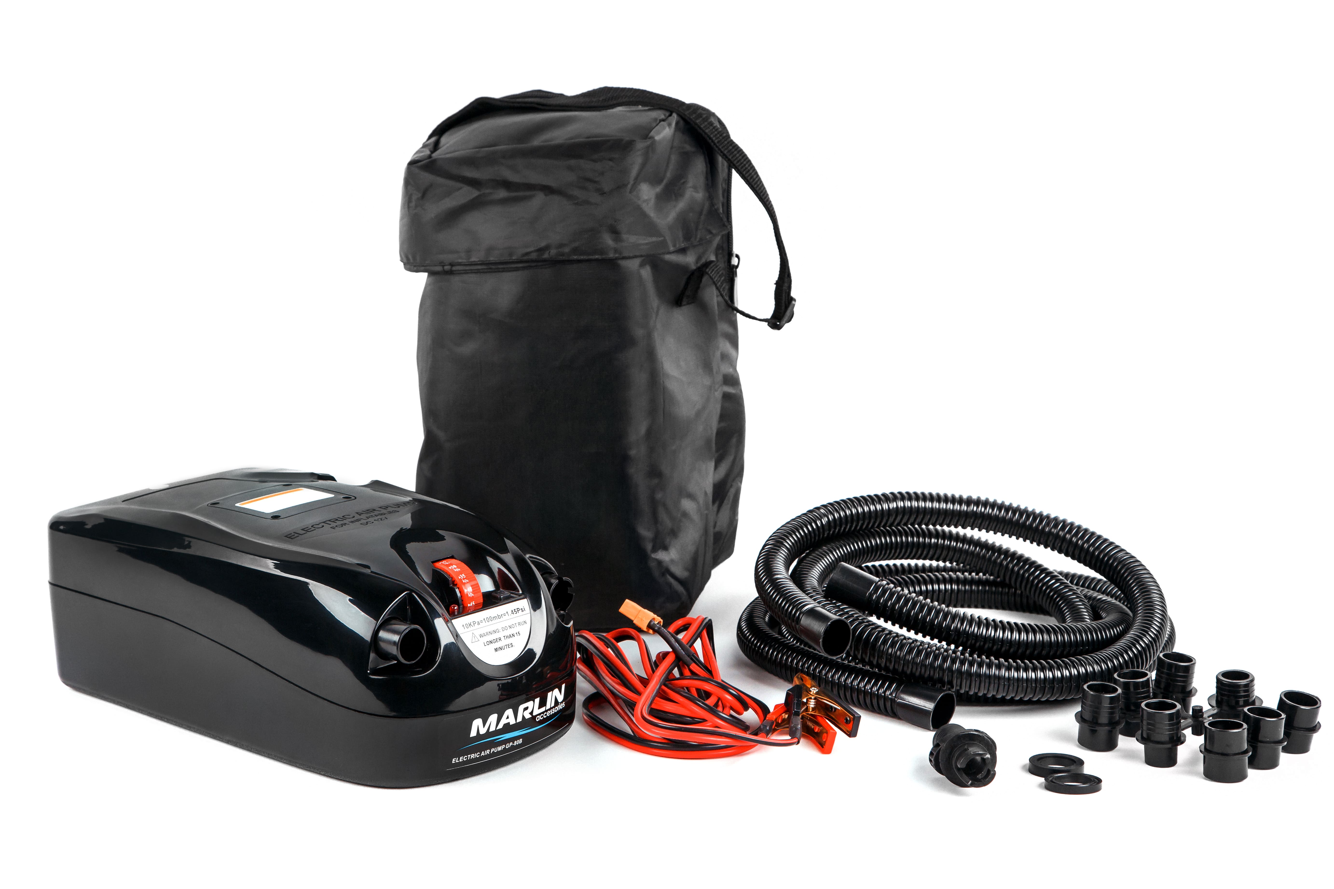 Двухступенчатый электрический насос высокого давления Marlin GP-80B может работать как от от автомобильных и прочих аккумуляторов напряжением 12V, так и от встроенного аккумулятора, который заряжается от сети 220V и автомобильного прикуривателя. Модель имеет надежный механический регулятор давления с шагом 0.05 бар. Подходит для накачивания надувных лодок ПВХ (в комплекте адаптер под вворачиваемый клапан и 9 переходников под воздушные клапаны различных диаметров), делая этот процесс гораздо более быстрым и удобным. Корпус из высокопрочного пластика защищает механизмы насоса от повреждений при ударах, а сумка из водонепроницаемой ткани – от загрязнения, попадания влаги, образования царапин, сколов и потертостей на корпусе при транспортировке и хранении устройства.