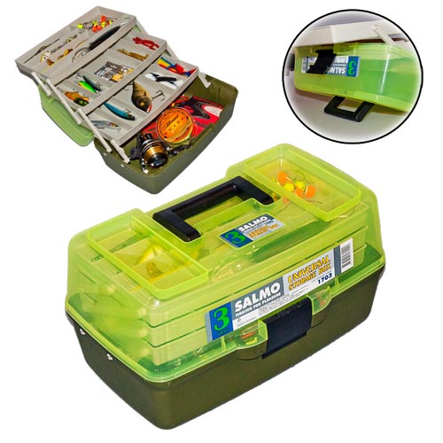 Бюджетный ящик Salmo c тремя подъёмными полками. Ящик более компактен и имеет меньший вес по сравнению с аналогами. Прозрачная крышка и ручка для переноски.