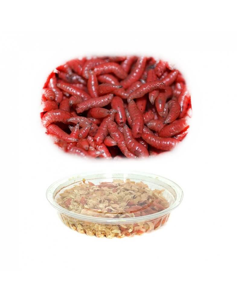 Крупный опарыш красного цвета в баночке с крышкой. Порция – столовая ложка.
