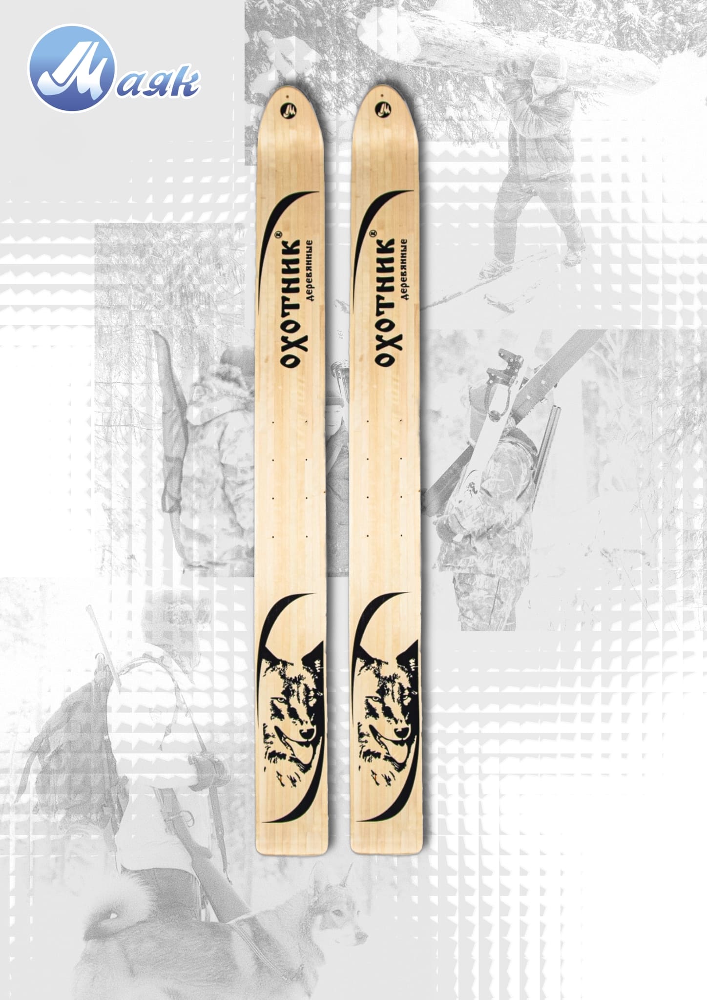 Промысловые лыжи "Охотник" от лыжной фабрики "Маяк" изготовлены из древесины лиственных пород (береза, осина). Склейка лыж произведена морозо- и влагоустойчивым клеем шведского производства, что придает им особую прочность. Покрытие лицевой стороны выполнено финским морозоустойчивым лаком с повышенным глянцем. Лыжи "Охотник" применяются в температурном диапазоне от -10 °С до -30 °С. Необходимым условием эксплуатации является смоление скользящей поверхности (для предотвращения намокания древесины) в течение зимы по мере её истирания, но не менее 1 раза в сезон.