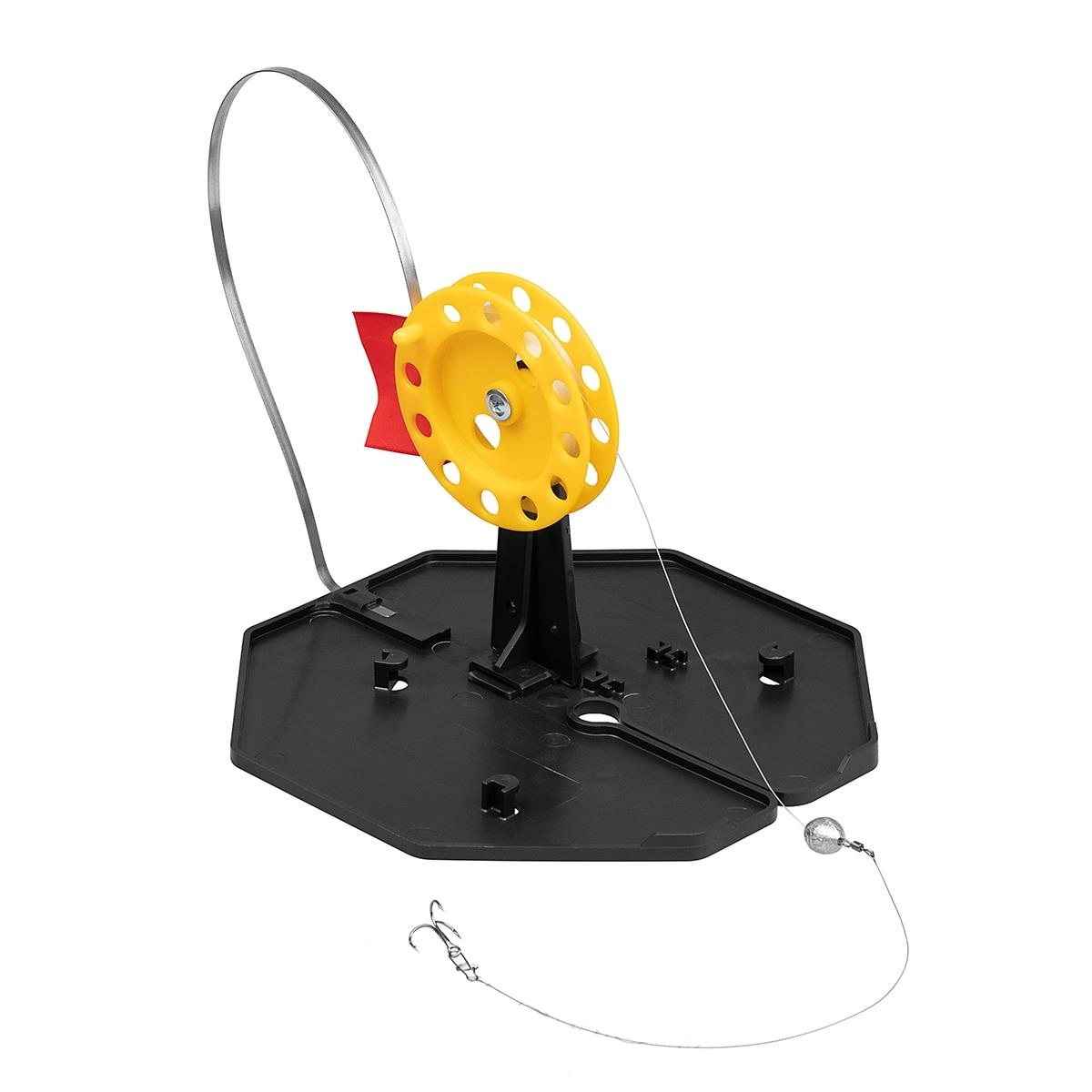 Оснащенная зимняя жерлица ТОНАР ЖЗО-03 имеет основание из морозостойкого полипропилена. Усиленная стойка катушки. Сигнальный флажок подогнут. Диаметр подставки – 210 мм, диаметр катушки – 85 мм. Снабжена 15 метрами лески диаметром 0.35 мм, скользящим грузилом весом 10 г, стальным поводком длиной 20 см и тройным крючком №6.