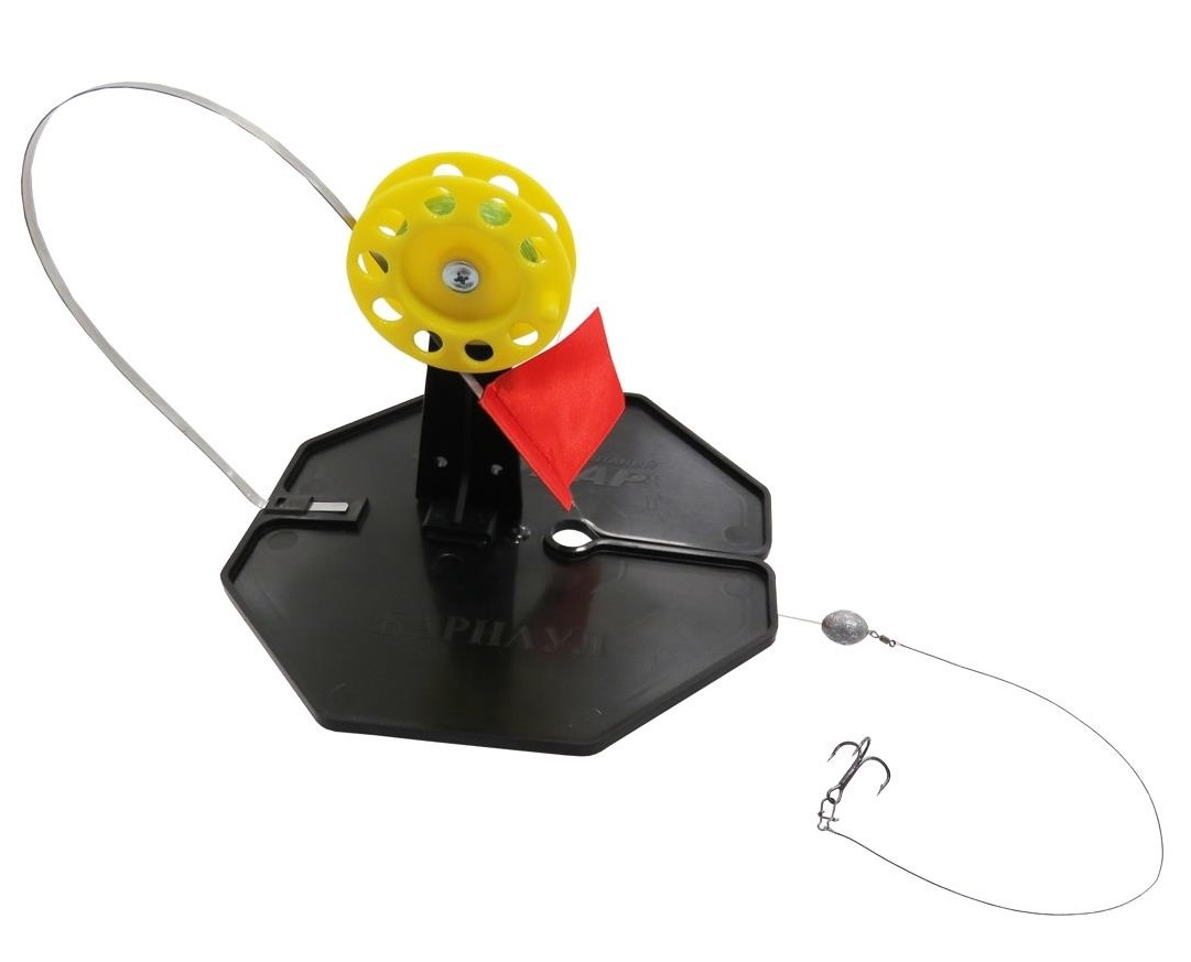 Жерлица зимняя оснащенная ТОНАР ЖЗО-03 для подледной ловли рыбы состоит из основания, стойки с катушкой и флажка-сигнализатора. Большое и прочное основание жерлицы из морозостойкого полипропилена гарантирует затемнение и защиту лунки от замерзания. Основание выполнено в виде восьмиугольника, что предотвращает проворачивание жерлицы в снегу. На основании оснащенной жерлицы ЖЗО-03 находятся прорезь для завода лески, паз под крепление стойки с катушкой, паз под крепление сигнального флажка. Стойка катушки усилена. Винт позволяет осуществлять регулировку вращения катушки. Надежная пружина флажка изогнута у основания и полностью готова к применению.